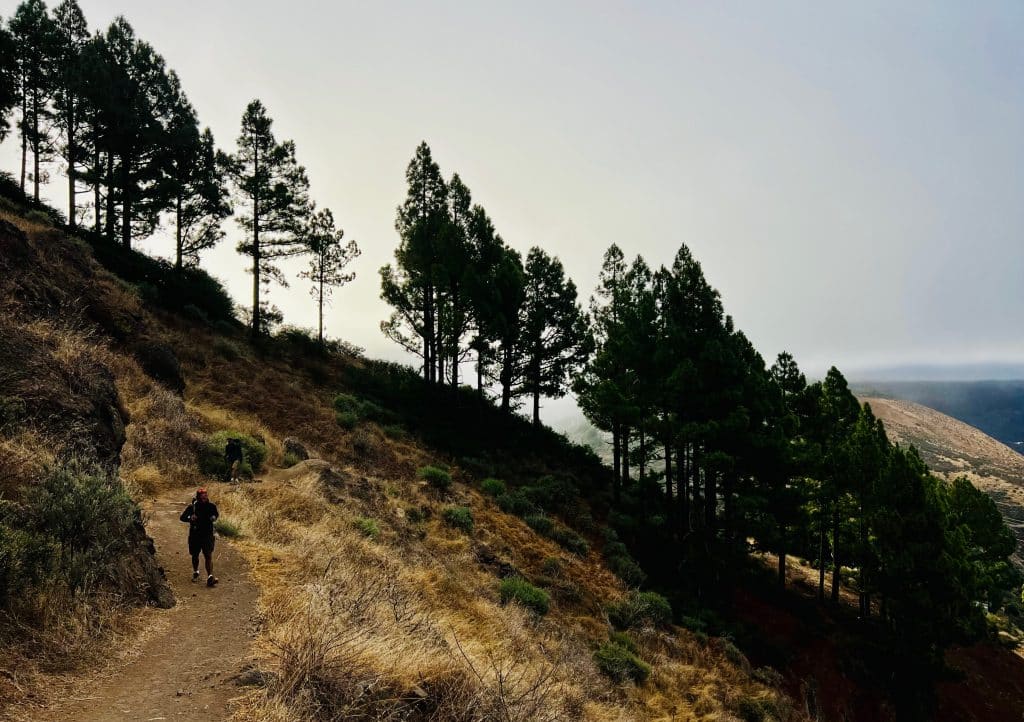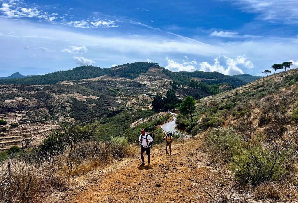 Reincorporados a la vereda S-54, encaramos la segunda tachuela del día: la Cuesta de Fataga. Se agradecieron las nubes, porque el ascenso —largo y tortuoso— exige piernas y paciencia. Son cuatro kilómetros de subida intensa bajo un bochorno persistente: apenas corre el aire por esta zona, el alisio se detiene en la cumbre. Solo arriba, en una planicie de pinos, encontramos alivio… y a Tunte a nuestros pies.