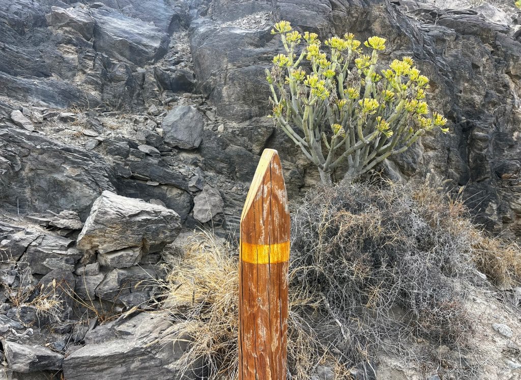 Nuestra senda, la S-54, está perfectamente señalizada: postes, paneles informativos y, cómo no, la flecha amarilla que guía a los peregrinos desde tiempos antiguos por el Camino de Santiago de Gran Canaria.