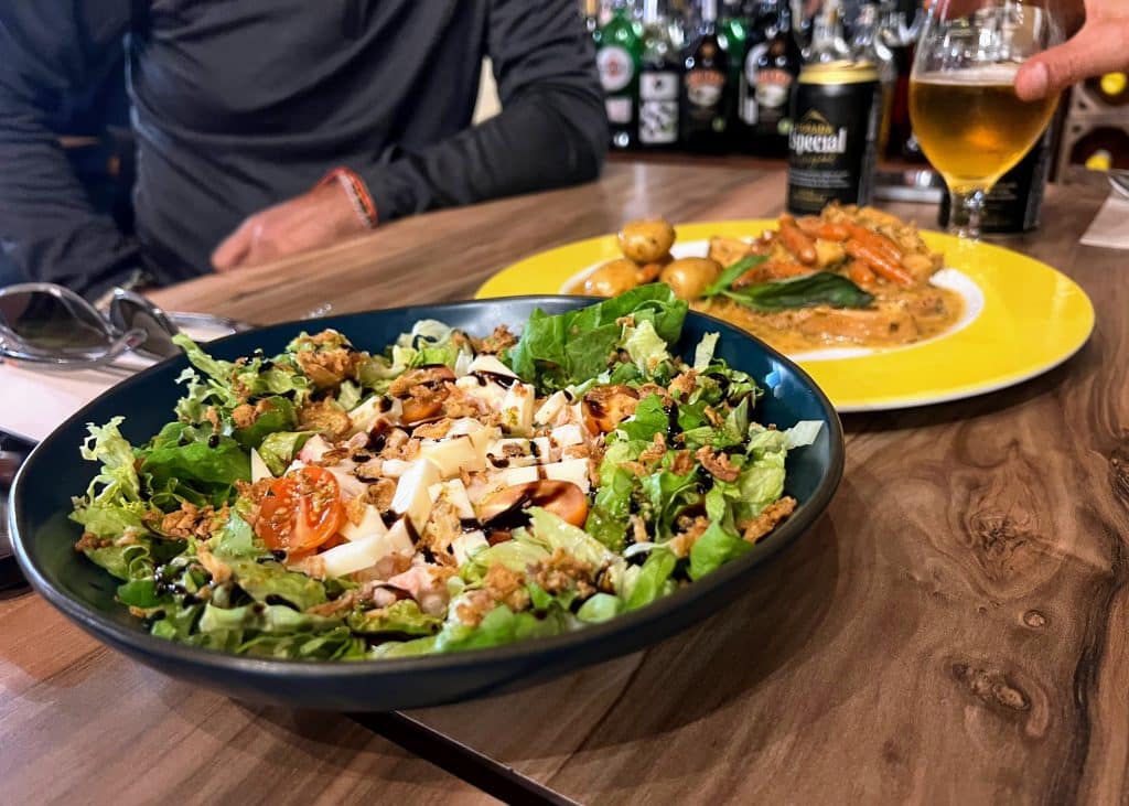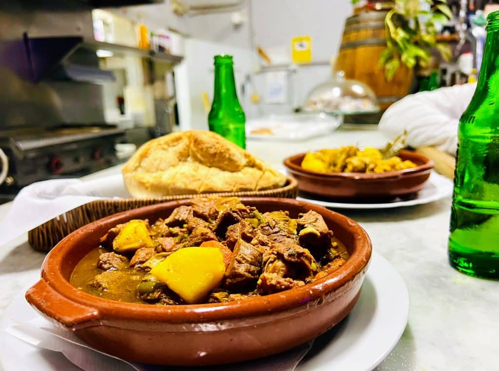 En el casco urbano hay una pequeña tienda, pero si te la encuentras cerrada —como nos ocurrió a nosotros— siempre queda la tiendita de la gasolinera DISA de Tunte. Allí aprovisionamos el agua del día siguiente antes de acomodarnos en la terraza exterior del Bar de las Cuatro Esquinas (mapa): ropavieja, estofado y una carne de cabra para chuparse los dedos.