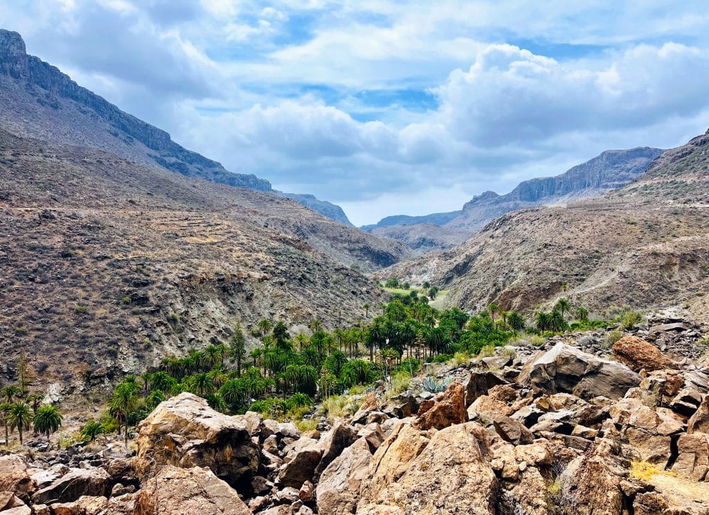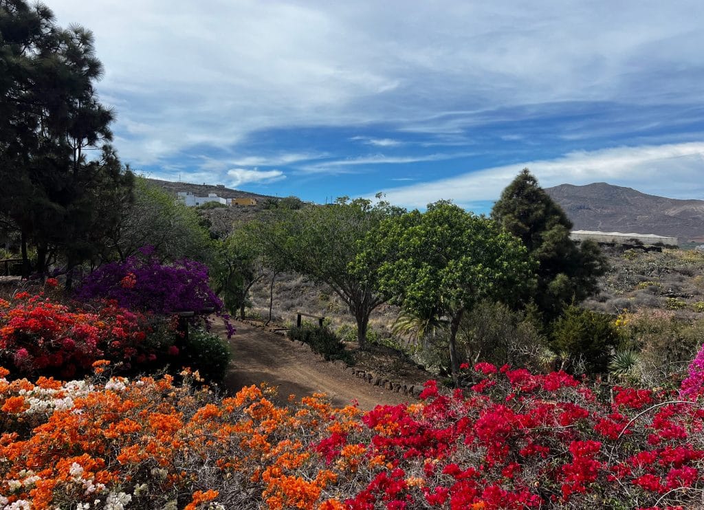 En la aparente nada, en plena naturaleza salvaje del Parque Natural de Pilancones, emerge un florido vergel. Entre la tupida vegetación y los robustos ejemplares de phoenix canariensis, la elegante palmera canaria, asoman los caserones diseminados que anuncian la llegada al Barranco de Fataga, un oasis verde que rompe la aridez del sur grancanario.