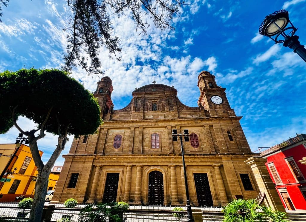 El Templo de Santiago de los Caballeros de Gáldar, arquitectura neoclásica con detalles barrocos, se erige sobre el antiguo palacio de los Guanartemes desde la Conquista (finales del siglo XV). Con tres naves, seis capillas laterales por lado, torres gemelas de 35 m y un órgano Walcker de 1912, es joya patrimonial de Canarias.
