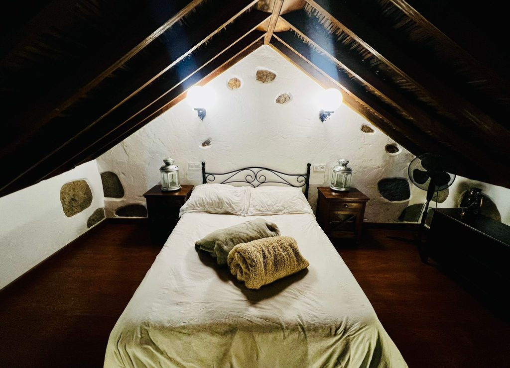Nos alojamos en el Apartamento Pancho Guerra, amplio, luminoso y con vistas a la montaña y al caserío de Tunte. Dispone de cocina equipada, baño completo, salón-cocina y una pintoresca buhardilla de madera con cama doble.