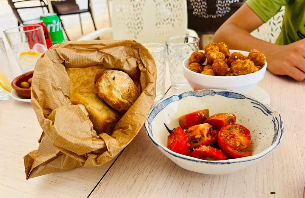 🍴 Los entrantes sorprendieron: pan del obrador vecino del Kamezí, tomates de Lanzarote en estado de gracia, zamburiñas con mojo rojo hervido, ensaladilla de batata y unas bolitas de pollo crujientes que hicieron las delicias de los niños.